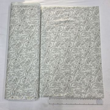 A soft ivory cotton fabric printed with an all-over scattered newspaper text design in muted black. The layered typography gives it a subtle vintage, editorial feel that works beautifully for quilting, light garments, and creative home décor projects.