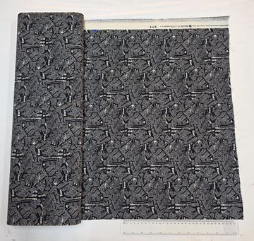 A playful black cotton fabric covered in an all-over white musical notes print. Crisp contrast and lively movement give this fabric a fun, rhythmic feel—perfect for quilting, children’s projects, accessories, and light apparel.