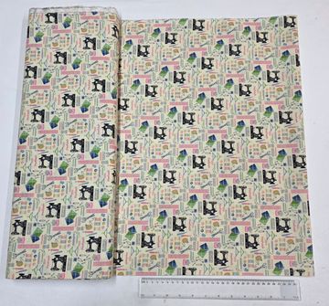 A charming cream cotton fabric featuring a colorful sewing-themed print with vintage machines, scissors, thread, and haberdashery icons. The cheerful palette and nostalgic design make it ideal for quilting, craft projects, accessories, and sewing-room décor.