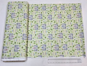 A soft green cotton fabric featuring a charming village scene with houses, trees, and whimsical details scattered throughout. The gentle color palette and storybook-style design give this fabric a calm, nostalgic feel—perfect for quilting, children’s projects, accessories, and light home décor.