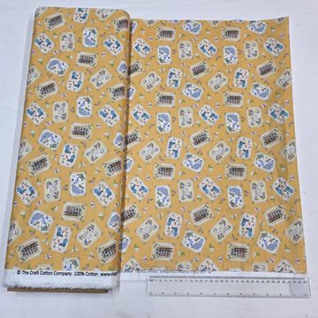 A warm mustard cotton fabric featuring an all-over patchwork-style print of vintage illustrations, florals, and decorative motifs. The rich background and delicate detailing give this fabric a nostalgic, storybook charm—ideal for quilting, accessories, craft projects, and light home décor.