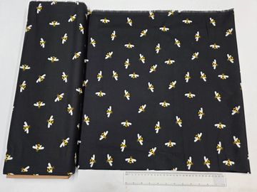 A charming cotton fabric featuring scattered golden bees with white wings on a deep black background. Sweet yet modern, this playful print adds personality without overpowering, making it perfect for quilting, children’s makes, accessories, and fun home décor projects.