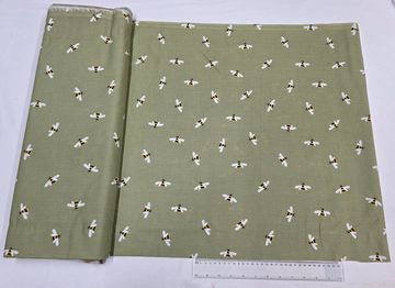A soft sage-green cotton fabric sprinkled with delicate golden bees and white wings. Calm, earthy, and endlessly versatile, this print brings a gentle charm to quilts, children’s projects, accessories, and relaxed home décor.