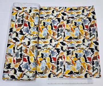 A playful cotton fabric featuring an all-over scatter of illustrated cats in warm, earthy tones on a soft cream background. Full of character and movement, this print is perfect for quilting, children’s projects, accessories, and fun home décor.